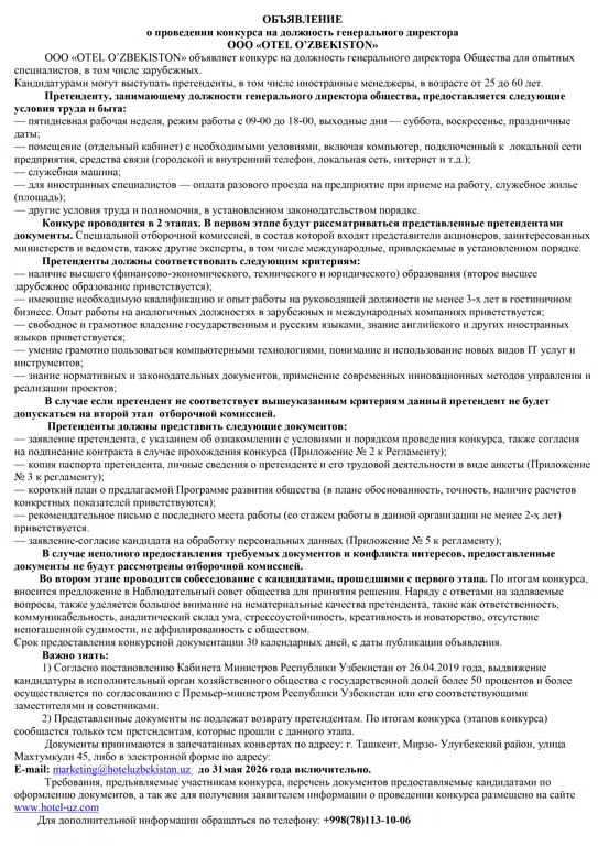 Bosh direktor lavozimiga tanlov o'tkazish to'g'risida e'lon